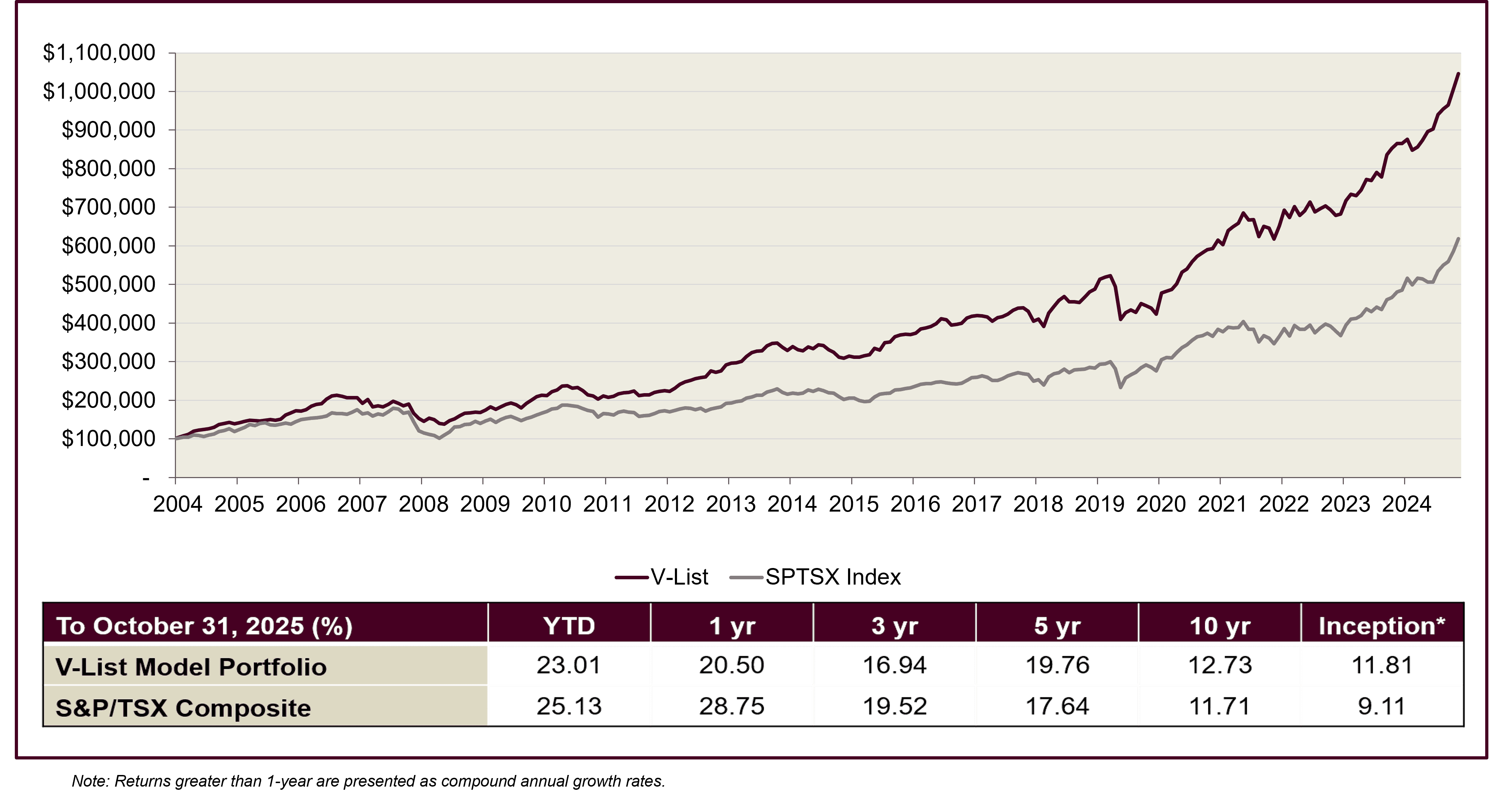 The V-List has outperformed the S&P/TSX Composite Index by 270 basis points (as of October 31, 2025, from inception on October 31, 2004).