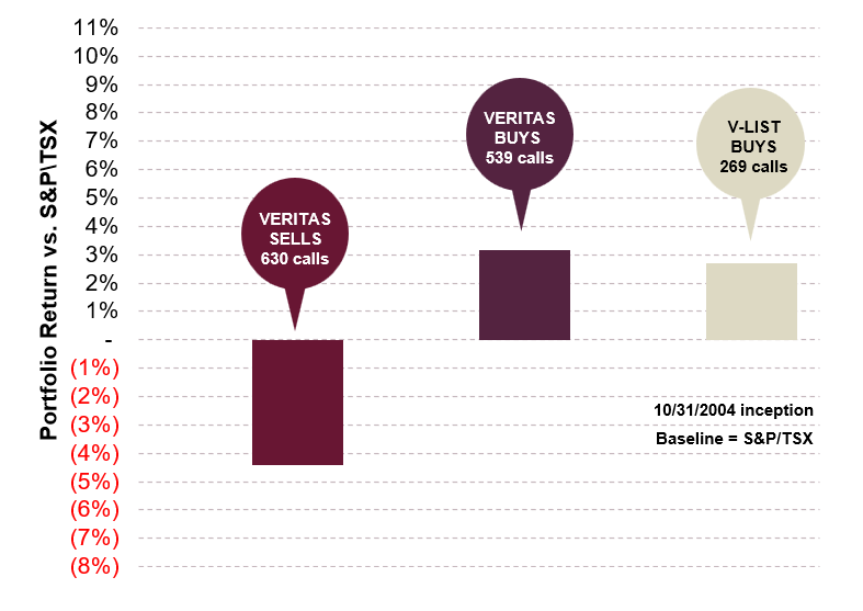 An equal-weighted portfolio of Veritas Sells/Reduces would have underperformed the S&P/TSX index by a compound annual growth rate of 441 basis points.