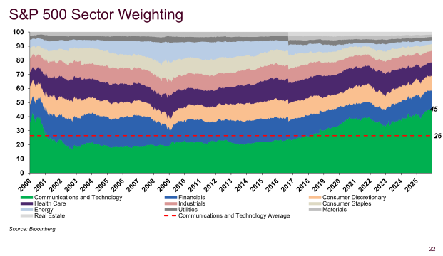 The green-shaded area below combines the Communications and Technology (basically AI) sectors of the S&P 500. At 45% of the index, it now outweighs Financials, Consumer Discretionary, Health Care, Industrials and Consumer Staples combined, and is higher than it was during the dot-com bubble.