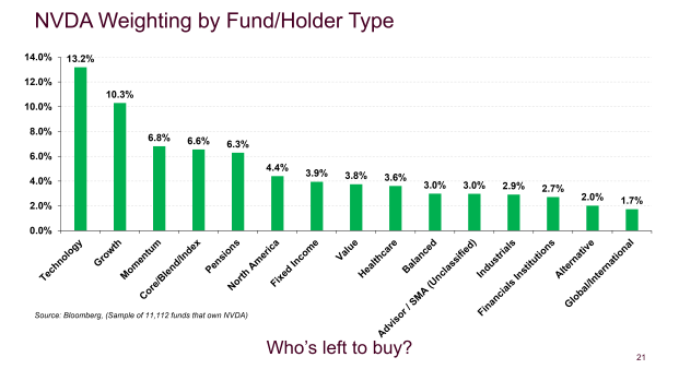 But AI is not the real risk. We looked up institutional holdings of NVDA across all North American funds with AUM above $1 billion and came away rather shocked, to the point where you have to wonder who else is left to buy the stock? As you can see, it's in every type of fund (value funds at 3.8%?!).